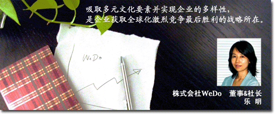 近6年来,我一直从事于全球人才教育开发业务,非常钦佩日本企业注入大量的精力和财力进行员工的个人能力开发。而同时,也痛感日本企业在应对全球化这一大趋势时,步子还迈得不够快、不够大。日本企业应该如何更有效率地应对市场和经营资源的全球化,在继续维持其世界经济领头羊的地位的同时,不失其作为日本企业所固有的个性和优势?这正是WeDo为客户企业所提供的服务的真髓,也是我们和客户企业应当共同考虑的课题。