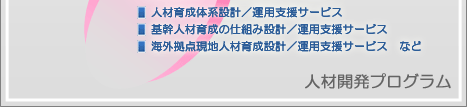 当社は、顧客企業様のマネジメント力強化や社員力向上などの課題に対して、最適なト人材開発プログラムと教育体系作りをご提案致します。私達は、文化・国境の枠を超え、 「共存共栄」のグローバル時代の「組織」と「人」の成長を支援致します。