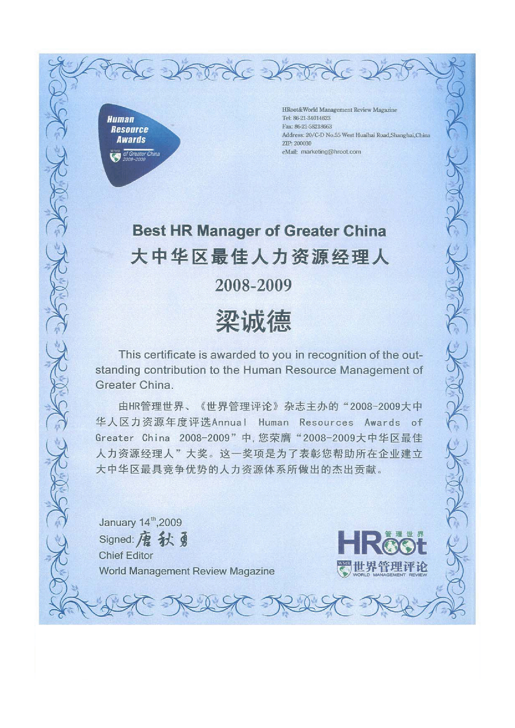 Management World」と「世界管理評論」誌の主催で、2年毎に、Great Chinaにおいて、約10名のBest HR